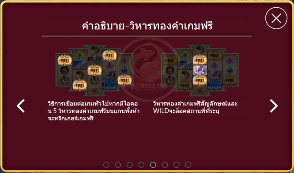 เมื่อวิหาญทองคำ ปรากฎขึ้นตั้งแต่ 5 อัน ผู็เล่นจะได้รับเกมฟรี ซึ่งจะมีสัญลักษณ์ Free Game วิหารทองคำ และสัญลักษณ์ Wild จะล็อคไว้ตรงกลาง