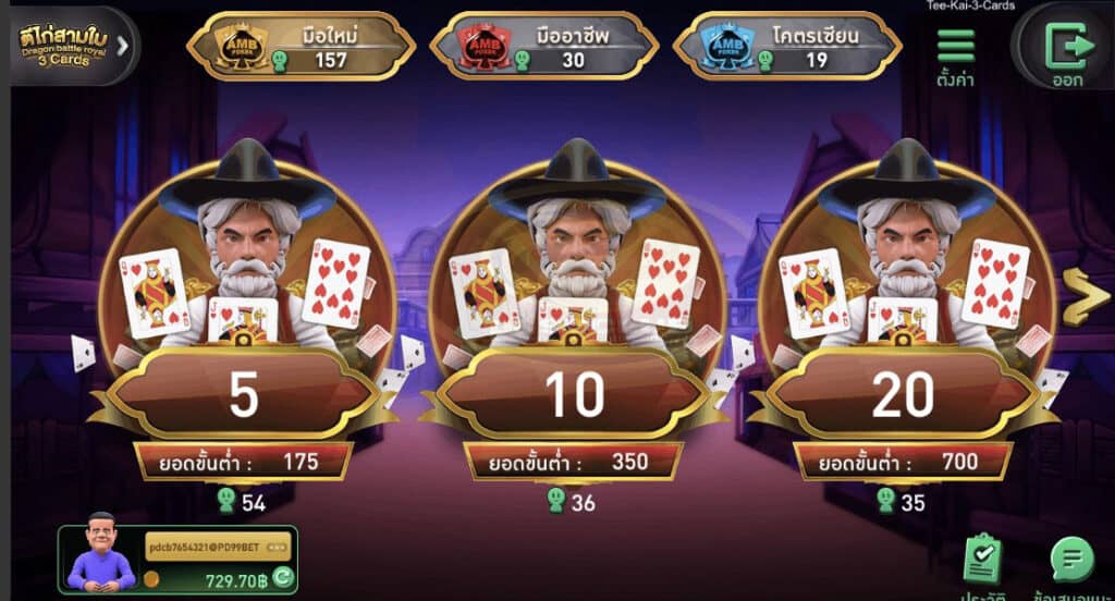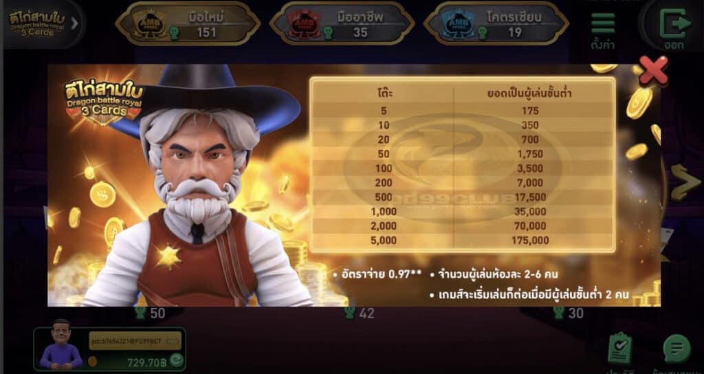 ราคาโต๊ะเเละยอดเป็นผู้เล่นขั้นตํ่าของเกม ตีไก่ 3 ใบ