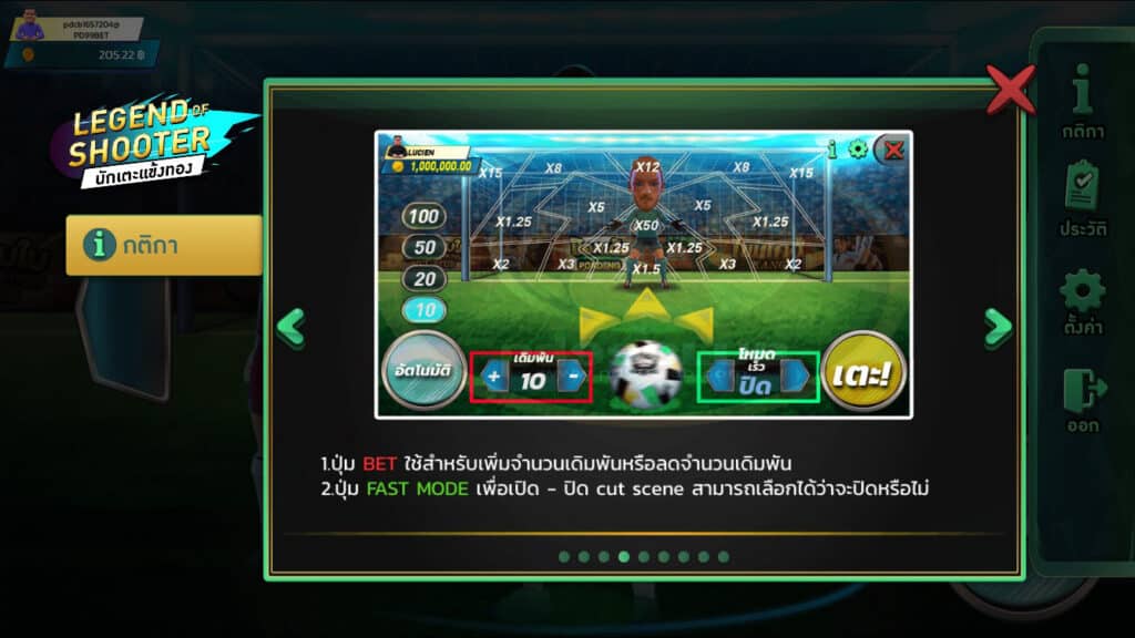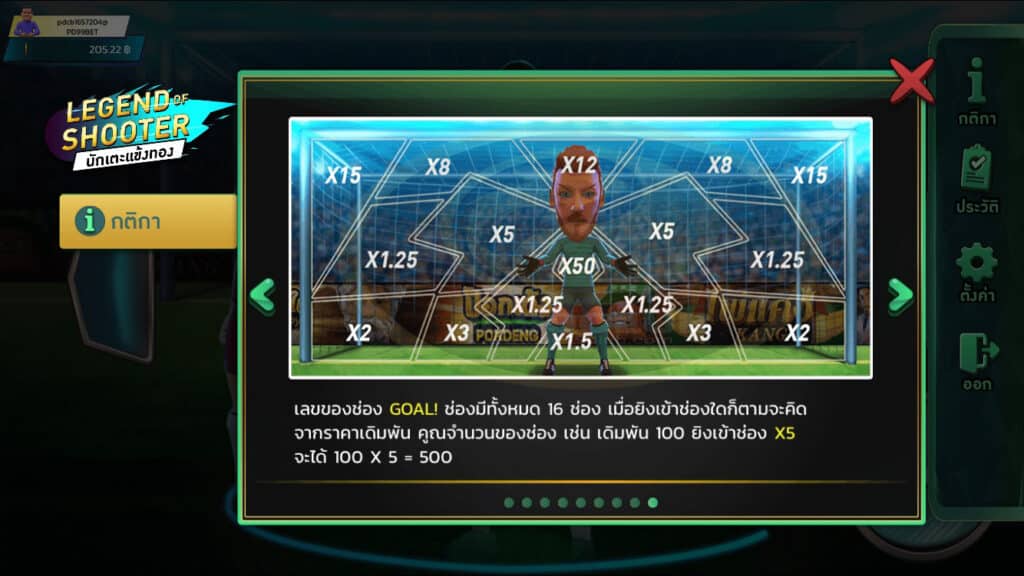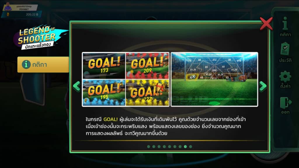 - เลขช่อง Goal ช่องมีทั้งหมด 16 ช่อง เมื่อยิงเข้าช่องใดก็ตามจะคิดจากราคาเดิมพันคูณจำนวนช่องเช่น เดิมพัน 100 ยิงเข้าช่อง x5 จะได้ 100 x 5=500