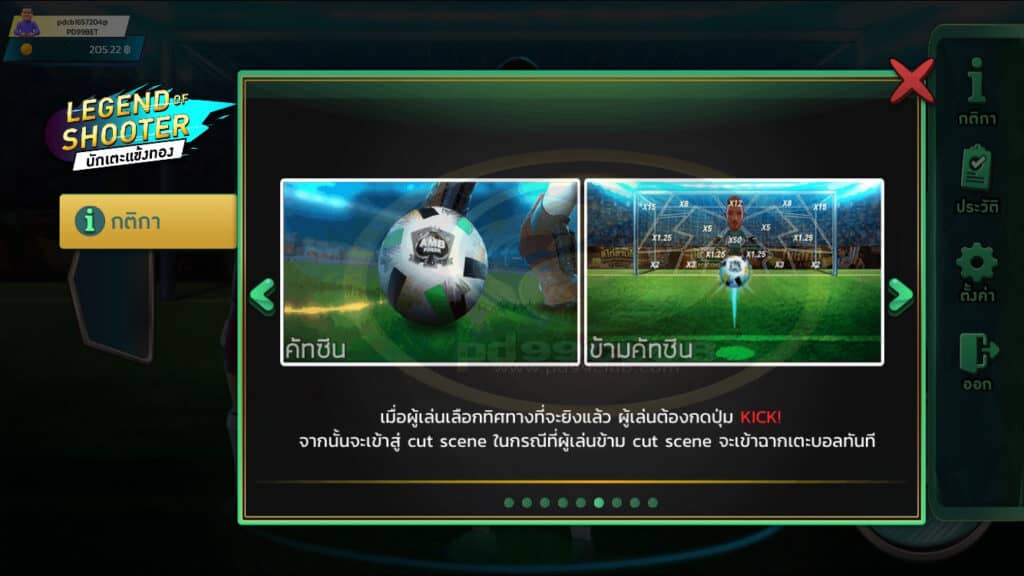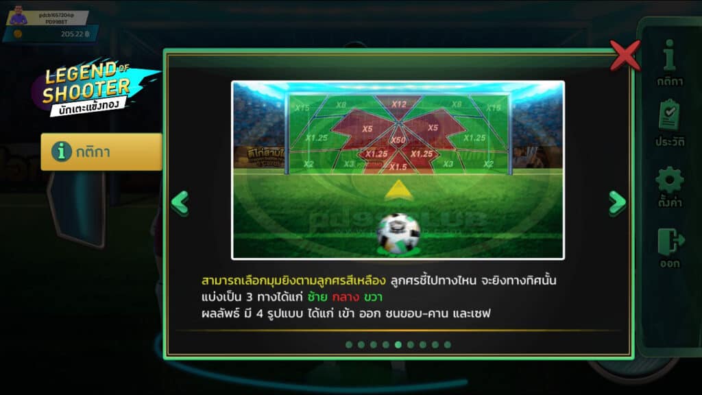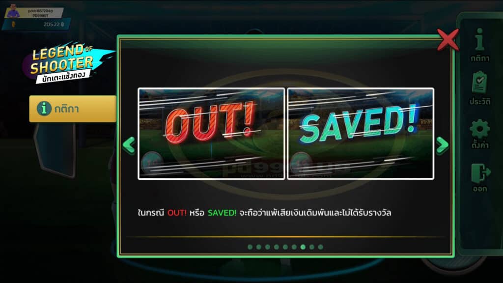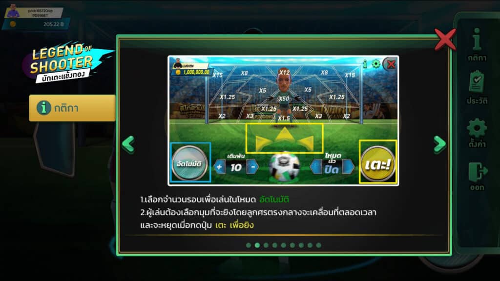 - สามารถเลือกมุมยิงตามลูกศรสีเหลือง ลูกศรชี้ไปทางไหน จะยิงทางทิศนั้นเเบ่งเป็น 3 ทางได้เเก่ ซ้าย กลาง ขวา ผลลัพธ์มี 4 รูปแบบได้แก่ เข้า ออก ชนขอบ-คาน และเซฟ