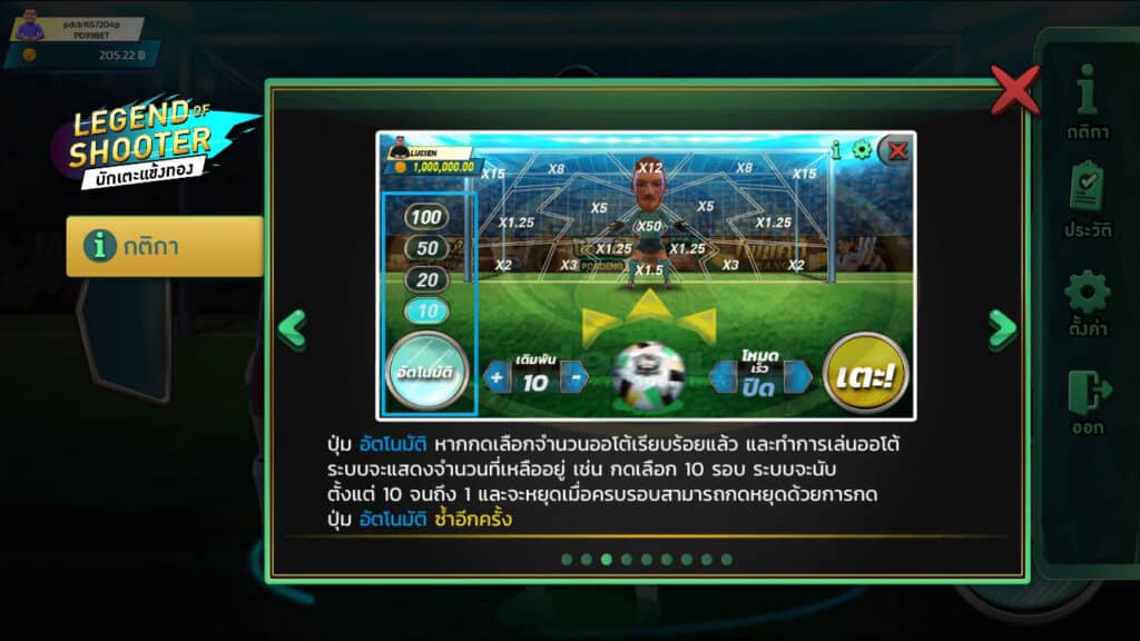 - ปุ่ม อัตโนมัติ หากกดเลือกจำนวนออโต้เรียบร้อยแล้ว เเละทำการเล่นออโต้ระบบจะเเสดงจำนวนที่เหลื่ออยู่เช่น กดเลือก 10 รอบ ระบบจะนับตั้งเเต่ 10 จนถึง 1 และจะหยุดเมื่อครบรอบสามารถกดหยุดด้วยการกดปุ่ม อัตโนมัติซํ่าอีกครั้ง