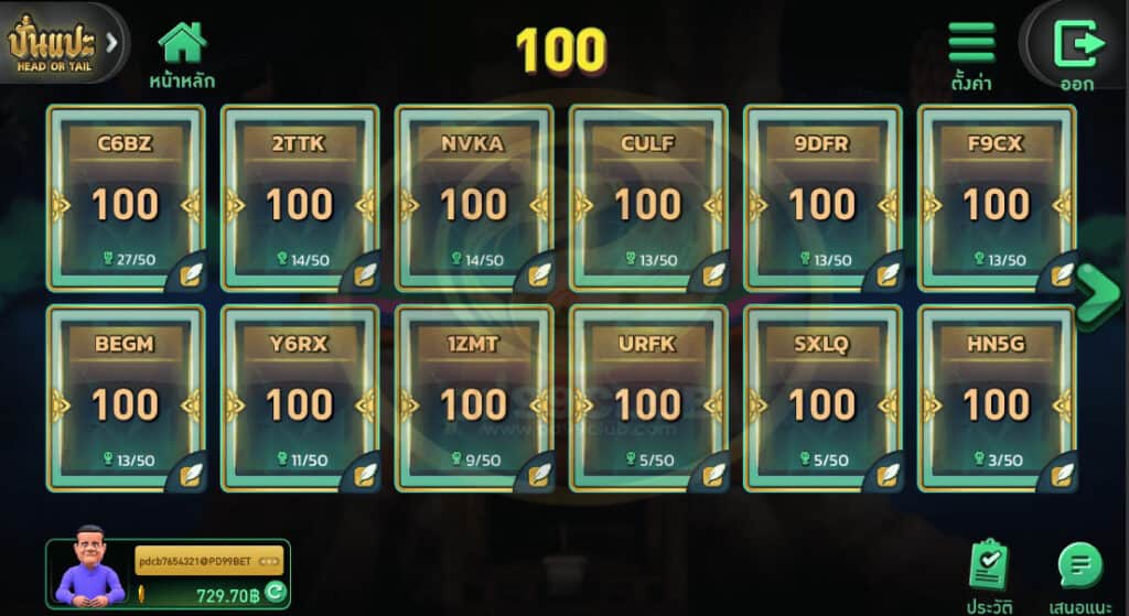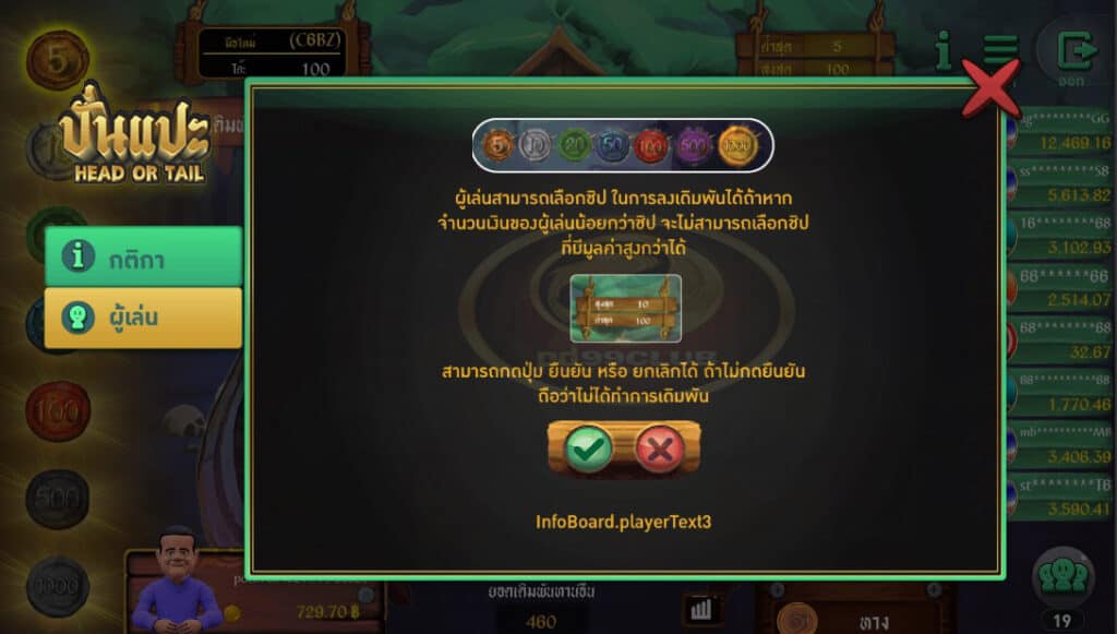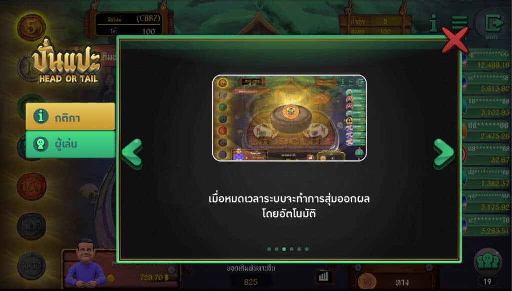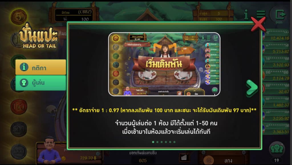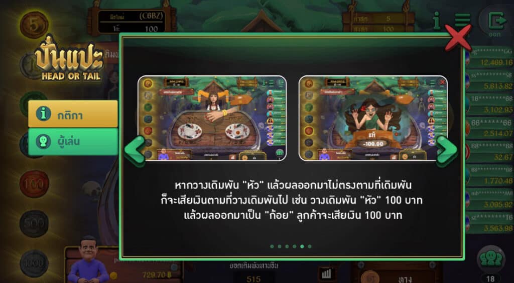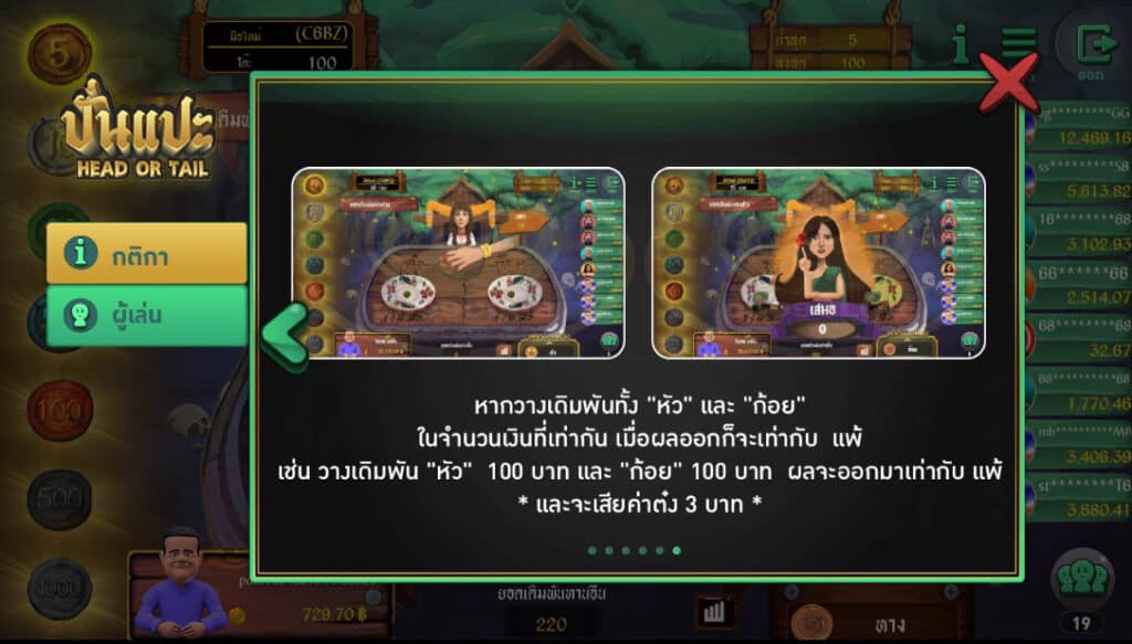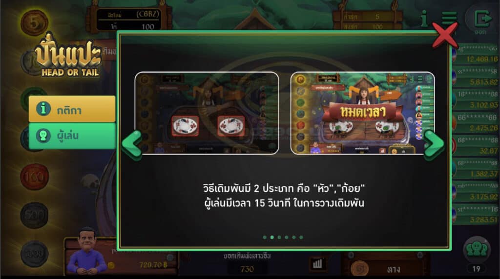 - วิธีเดิมพันมี 2 ประเภท คือ “หัว” และ “ก้อย” ผู้เล่นมีเวลา 15 วินาที ในการวางเดิมพัน