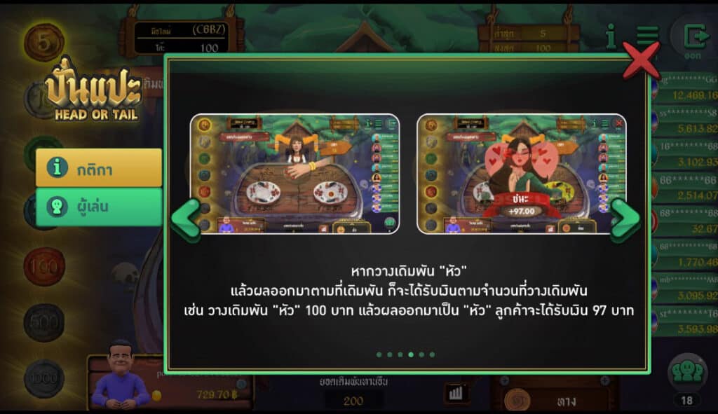 - หากวางเดิมพัน “หัว” เเล้วผลออกมาตามที่เดิมพันก็จะได้รับเงินตามจำนวนที่วางเดิมพันเช่น วางเดิมพัน “หัว” 100 บาทแล้วผลออกมาเป็น “หัว” ลูกค้าจะได้รับเงิน 97 บาท