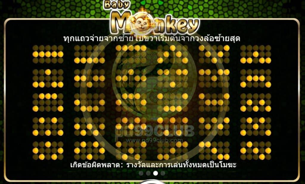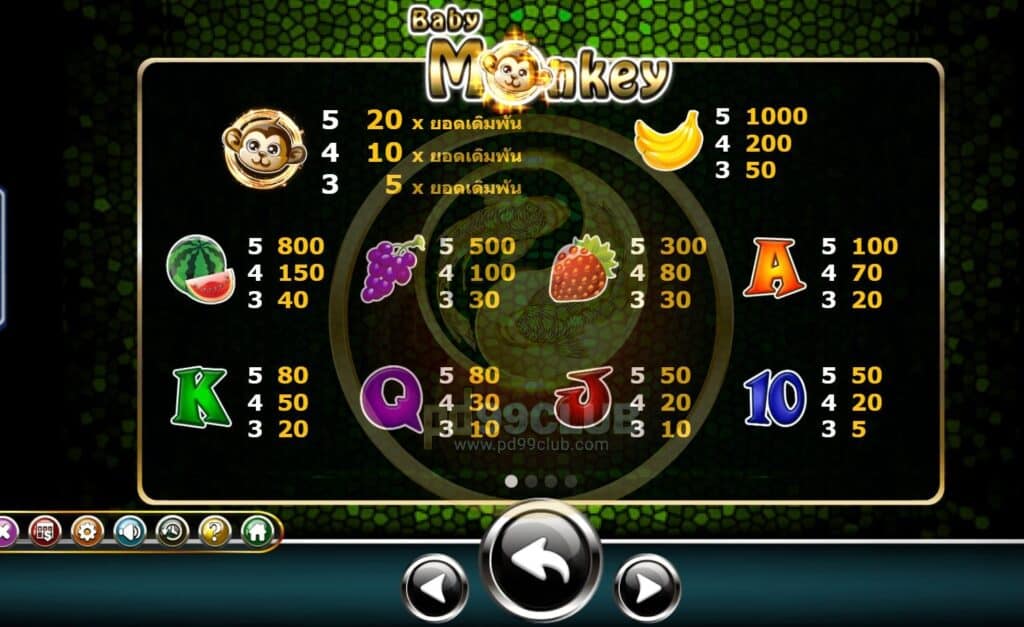 - หากหมุนได้รูปลิงน้อย ตรงกันทั้งหมด 5 ตัว (ตามเส้นเรียงจากด้านซ้ายไปขวา) ผู้เล่นจะได้รับเงินรางวัลคูณ 20 เท่าของเงินเดิมพัน หากหมุนตรงกันได้ 4 ตัว ผู้เล่นจะได้รับรางวัล 10 เท่าของเงินเดิมพัน และหากหมุนได้ 3 ตัว ผู้เล่นจะได้รับเงินรางวัลคูณ 5 เท่าของเงินเดิมพัน