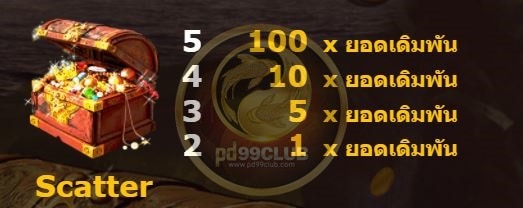 • สัญลักษณ์ Scatter (สแคทเทอร์) เป็นรูปหีบสมบัติ สัญลักษณ์นี้มีความพิเศษที่เมื่อปรากฏกตรงใดก็ได้ในเกมส์ 2 สัญลักษณ์ขึ้นไปจะได้รับเงินรางวัลคูณ 1 เท่า และแจกสูงสุด 100 เท่าสำหรับปรากฏ 5 ขึ้นไป