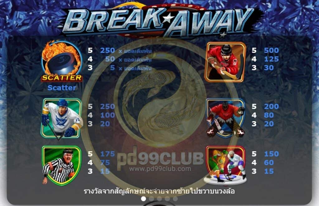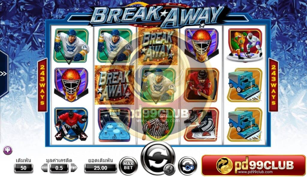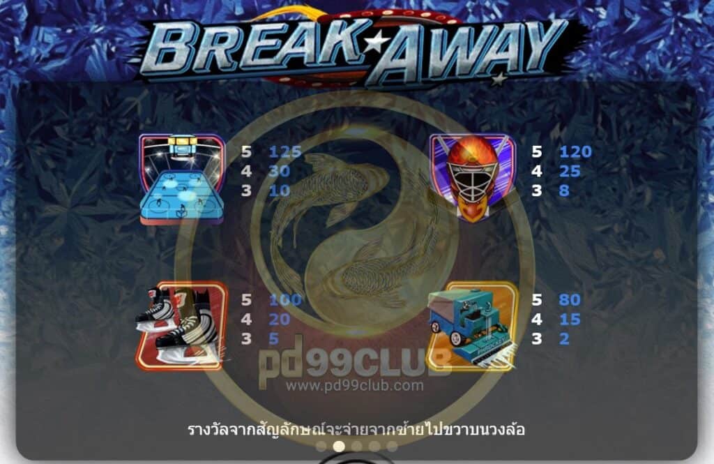 สำหรับเกมสฺสล็อต Break away นี้มีวิธีการชนะได้หลายวิธีทางเราจะจ่ายรางวัลจากเส้นทางซ้ายมือไปทางขวามือเท่านั้นไม่มีการเปลี่ยนแปลงในระหว่างการเล่นเกมส์ยกเว้นแค่เพียงสแคทเทอร์รูปแบบการเงินบาทต่อบาทปกติ เกมส์นี้มีช่องแสดงผล 15 ช่องด้วยกัน สามารถปรับลดเบทได้ตลอดการเล่นเกมส์ดเิมพันโดยไม่มีเงื่อนไขการห้ามใดๆทั้งสิ้น สามารถปรับได้ตามงบที่ผู้เล่นมีโดยรวมๆเกมส์นี้เหมาะสำหรับงบน้อยมากๆ แอดแนะนำเลยค่ะ