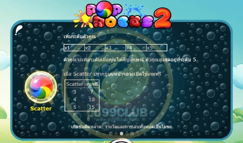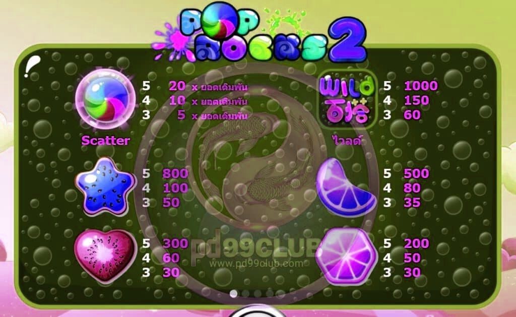 วันนี้แอดมินจะมาแนะนำเกมส์สล็อตชื่อดัง แตกง่ายแตกดี โบนัสพร้อมแจ็คพ็อตโคตรจุกนั่นก็คือเกมส์ Pop Rock 2 ของค่าย amb988 ที่มาในรูปแบบขนมลูกอมและผลไม้สีสันสดใสเหมือนหลุดไปอยู่ในช่วงหน้าร้อนหรือซัมเมอร์ที่ฮาวาย มีทั้งหมด 5 รีลแลน 3 แถวสัญลักษณ์พิเศษต่างๆภายในเกมส์ก็จะมีอธิเช่น ลูกกวาดสายรุ้ง, กีวี, แตงโม, เลม่อน และองุ่นเป็นต้น ซึ่งทางเราขอชวนให้ผู้เล่นได้ลิ้มลองเล่นกัน โดยเกมส์หลักๆ ส่วนใหญ่จะมาในผลไม้เห็นแล้วเป็นต้องหิวหรือเปรี้ยวปากแน่นอน โดยเกมส์เกมส์นี้มีจำนวนไลน์ทั้งหมด 30 ไลน์ วางเดิมพันต่ำสุดที่ 4.50 บาทและสามารถวางเดิมพันได้สูงสุดถึง 3000 บาทซึ่งงบการเดิมพันตรงนี้ลูกค้าสามารถเลือกปรับลดเบทได้ โดยไม่มีเงื่อนไขผูกมัดการเล่นใดๆทั้งสิ้นและเกมส์นี้ให้เงินรางวัลชนะตัวคูณสูงสุด 20 เท่ากันเลยทีเดียว