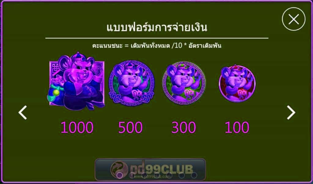 เกมสล็อตหนูรวยทรัพย์เกมนี้จะไม่มีรางวัล Wild หรือ Scatter ให้คุณเล่นอีกทั้งเพย์ไลน์แต่รางวัลจะไปหนักกับตัวละครที่ได้จากเกม อัตราการจ่ายเงินก็ง่ายมากๆอีกด้วยสำหรับเกมนี้เเอดให้คะเเนนที่ 8/10 คะเเนนเลยทีเดียว ถือเป็นว่าคะเเนนความง่ายสูงมากเลยทีเดียว
