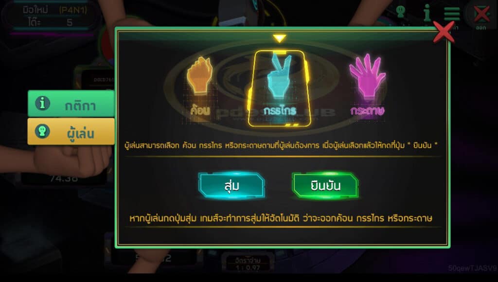 - หากผู้เล่นกดปุ่มสุ่ม เกมจะทำการสุ่มให้อัตโนมัติ ว่าจะออกค้อน กรรไกรหรือกระดาษ