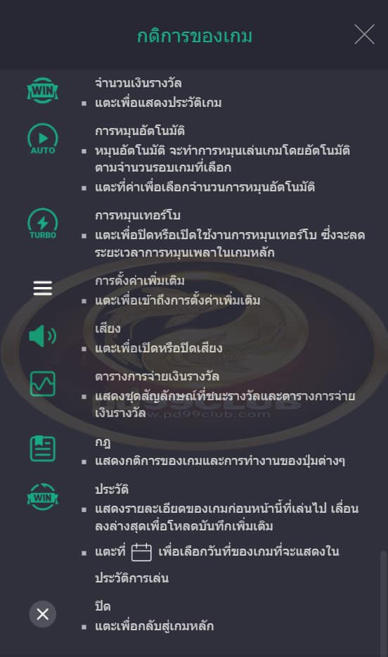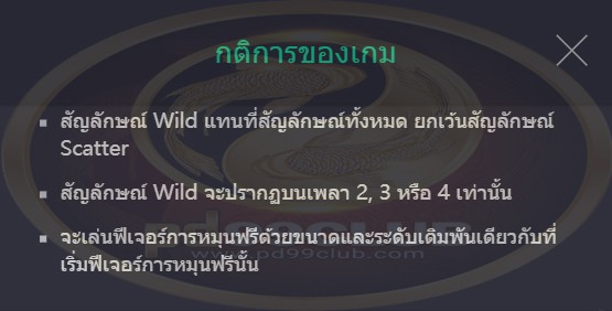 • จะเล่นฟีเจอร์การหมุนฟรีด้วยขนาดและระดับเดิมพันเดียวกันกับการหมุนที่เริ่มฟีเจอร์การหมุนฟรีนั้น