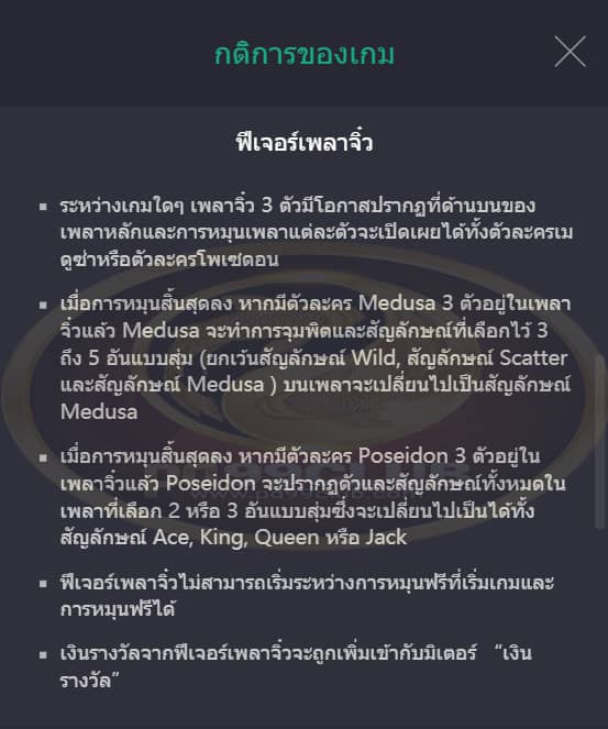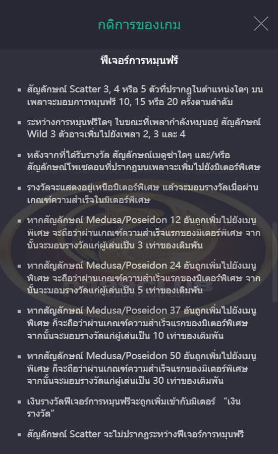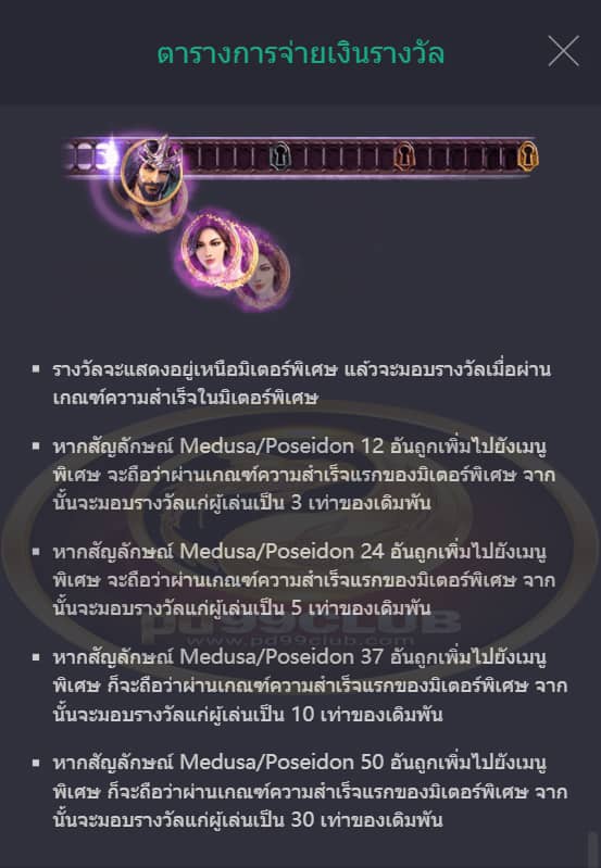 • หากสัญลักษณ์ Medusa/Poseidon 50 อันถูกเพิ่มไปยังเมนูพิเศษะถือว่าผ่านเกณฑ์ความสำเร็จแรกของมิเตอร์พิเศษ จากนั้นจะมอบรางวัลผู้เล่นเป็น 30 เท่าของเดิมพัน