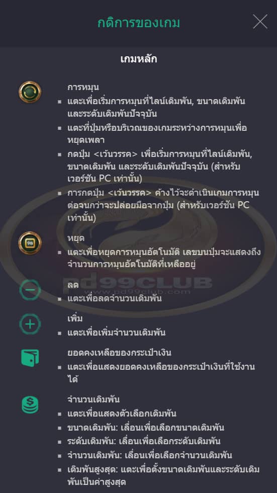 • ระดับเดิมพัน: เลื่อนเพื่อเลือกระดับเดิมพัน