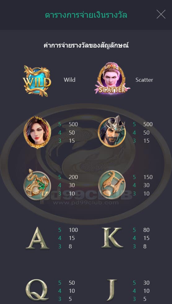 • ค่าการจ่ายรางวัลของสัญลักษณ์มีทั้งหมด 10 สัญลักษณ์