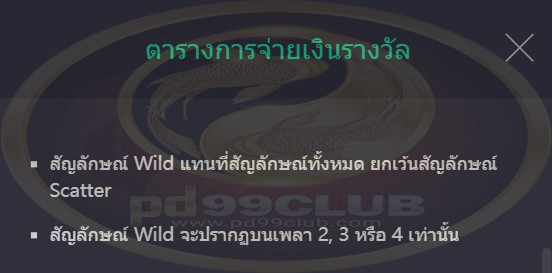 • สัญลักษณ์ Wild แทนที่สัญลักษณ์ทั้งหมดยกเว้นสัญลักษณ์ Scatter