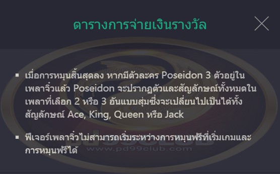 • เมื่อการหมุนสิ้นสุดลง หากมีตัวละคร Poseidon 3 ตัวอยู่ในเพลาจิ๋วแล้ว Poseidon จะปรากฏตัวสัญลักษณ์ทั้งหมดในเพลาที่เลือก 2 หรือ 3 อันเเบบสุ่มซึ่งจะเปลี่ยนไปเป็นได้ทั้งสัญลักษณ์ Ace, King , Queen หรือ Jack