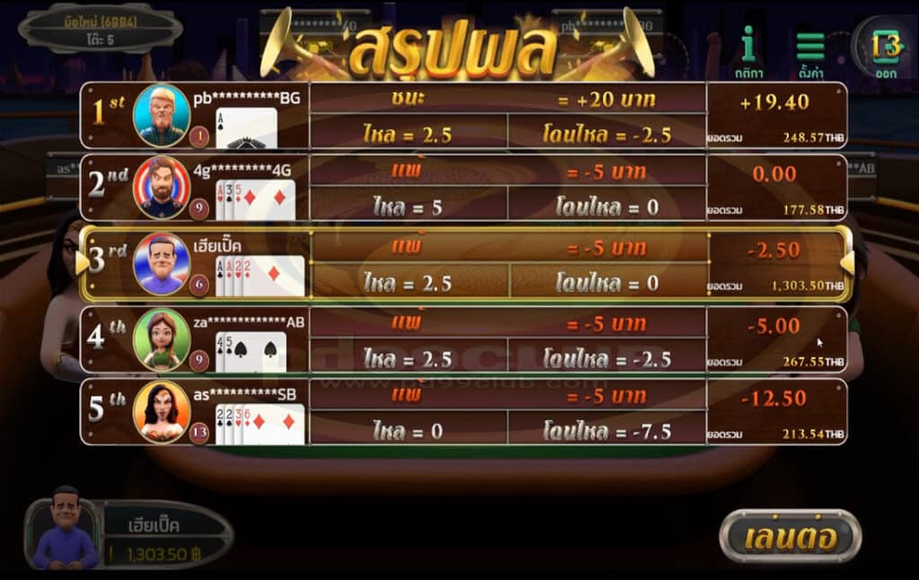 - ระบบเกมจะเริ่มทำการวัดผลทุกคนโดยการหงายไพ่ทุกคนบนโต๊ะ เพื่อวัดผลใครได้เเต้มน้อยที่สุดเเละเคลียเงินให้ผู้เล่นที่ชนะ