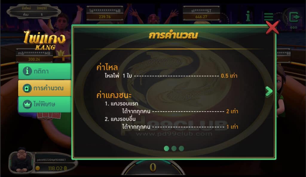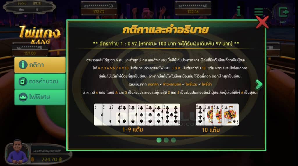 - ผู้เล่นสามารถเลือกห้องไพ่เเคง เพื่อสามารถเข้าร่วมสนุกให้เลือกเข้าห้องเพื่อเล่นเกม