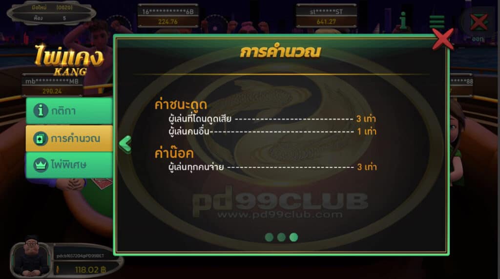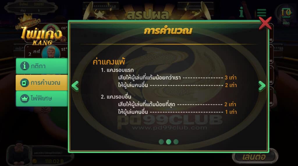 - ระบบเกมจะทำการสรุปผลเกมไพ่เเคงให้อัตโนมัติ (เป็นรูปแบบตาราง) ผู้เล่นสามารถดูสถิติตัวเองได้จากช่องของตนเอง