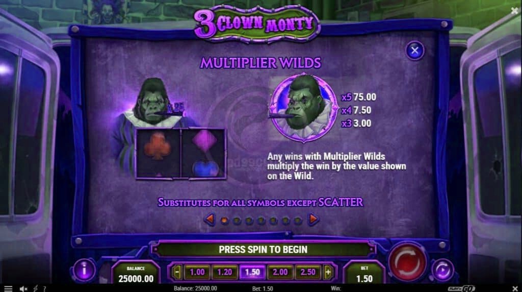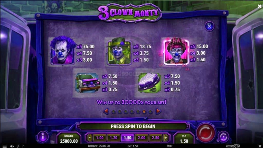 3 Clown Monty เล่นบน 5 วงล้อ 3 แถวและ 10 ช่องจ่ายเงิน ง่ายเหมือนเกมสล็อตคุณต้องวางสัญลักษณ์จับคู่ 3, 4 หรือ 5 จากซ้ายไปขวาบนวงล้อที่อยู่ติดกันและบนช่องจ่ายเงิน 10 ช่อง มีความผันผวนสูงโดยให้คะแนนความแปรปรวนเป็น 9/10 ซึ่งหมายความว่าชัยชนะที่ยิ่งใหญ่นั้นยากที่จะบรรลุ ผลตอบแทนที่เป็นไปได้นั้นคุ้มค่ากับความเสี่ยงเนื่องจากการชนะสูงสุดคือ 20,000x เงินเดิมพันทั้งหมดของคุณ