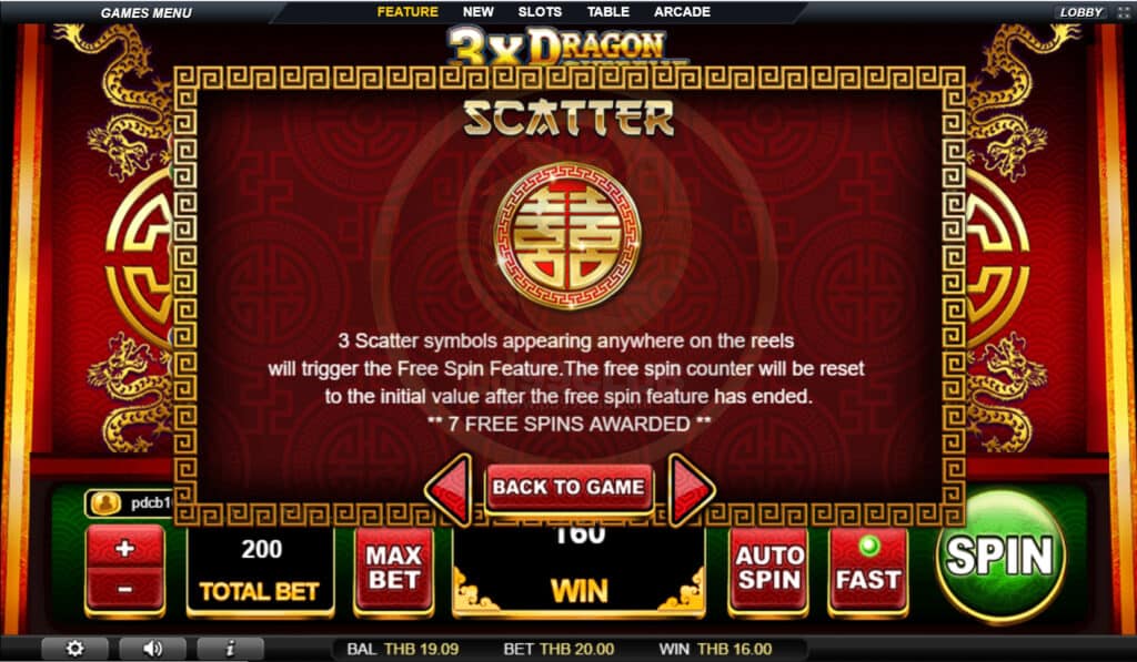 สัญลักษณ์ Scatter 3 สัญลักษณ์กระจายที่ปรากฏที่ใดก็ได้บนวงล้อจะเรียกใช้คุณสมบัติหมุนฟรีตัวนับการหมุนฟรีจะถูกรีเซ็ตเป็นค่าเริ่มต้นหลังจากคุณสมบัติการหมุนฟรีสิ้นสุดลง ** 7 รางวัลหมุนฟรี **