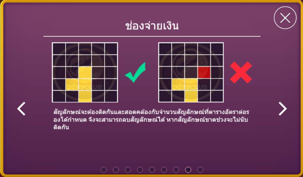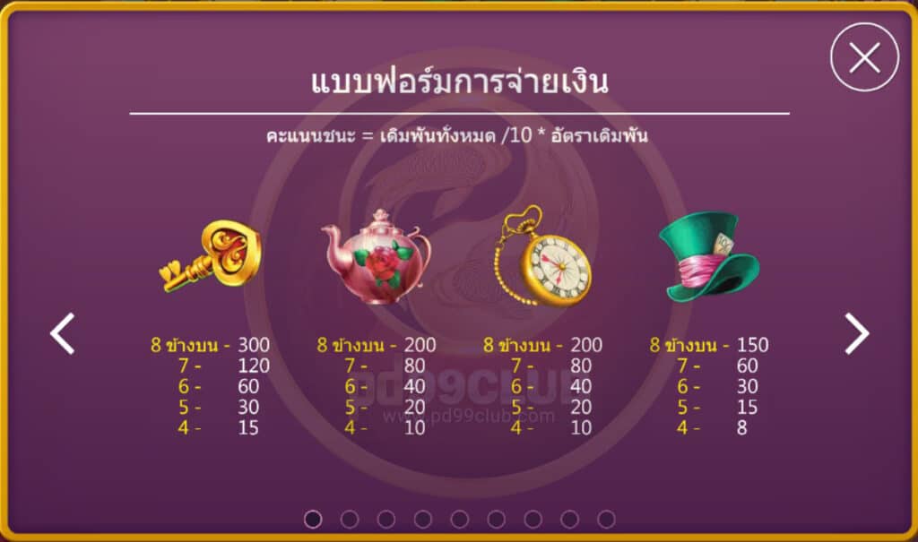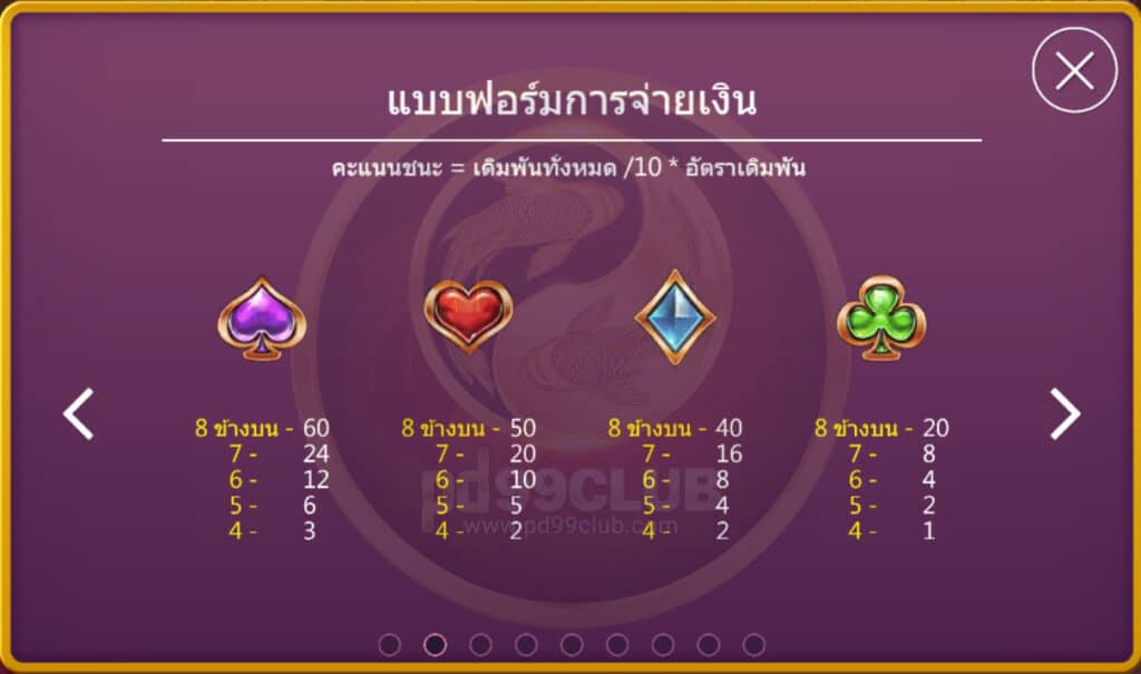 มีทั้งหมด 8 สัญลักษณ์ คะแนนชนะ=เดิมพันทั้งหมด/10*อัตราเดิมพัน
