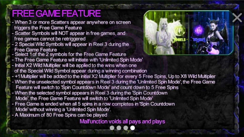 - ปีศาจ : เงินรางวัลตามจำนวนวงล้อ ดังนี้ 5 , 4 , 3 วงล้อ จ่าย 1,000 , 500 , 45 เหรียญ คูณจำนวนเงินวางเดิมพันทั้งหมด