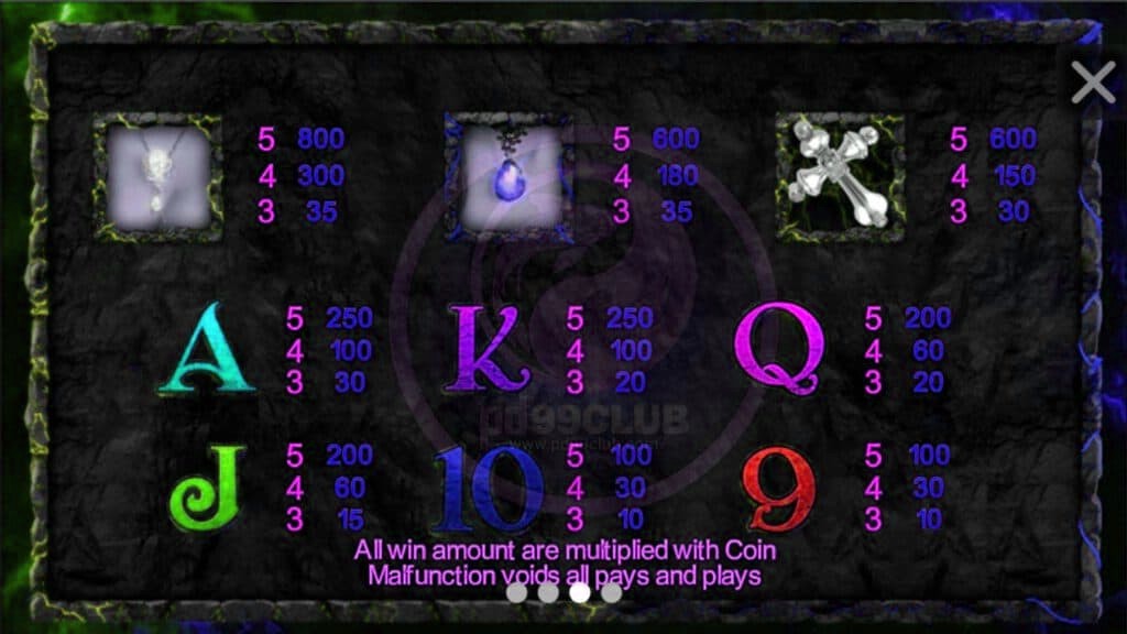 - สร้อยคอของปีศาจ : เงินรางวัลตามจำนวนวงล้อ ดังนี้ 5 , 4 , 3 วงล้อ จ่าย 600 , 180 , 35 เหรียญ คูณจำนวนเงินวางเดิมพันทั้งหมด