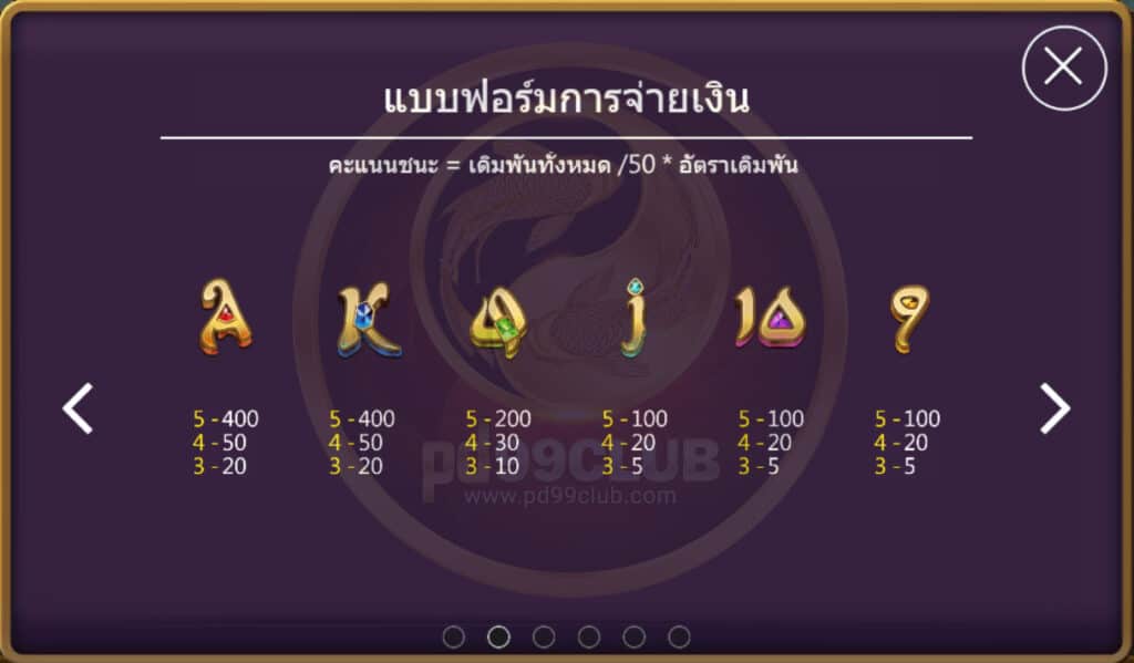จะมีด้วยกันทั้งหมด 11 สัญลักษณ์ คะแนนชนะ=เดิมพันทั้งหมด/50*อัตราเดิมพัน