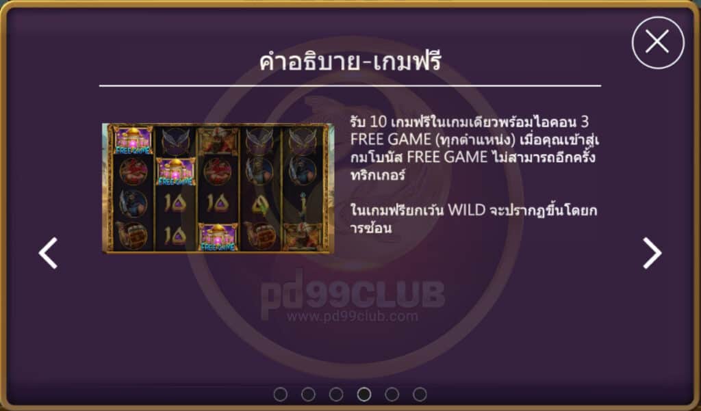 รับ 10 เกมฟรีในเกมเดียวทันที พร้อมไอคอน 3 Free Game (ทุกตำแหน่ง) และเมื่อเข้าสู่เกมโบนัส Free Game จะไม่สามารถ อีกครั้งทริกเกอร์ ในเกมฟรีได้ ยกเว้นแต่ผู้เล่นได้ Wild ที่ปรากฏขึ้นมาในรูปแบบซ้อนกัน