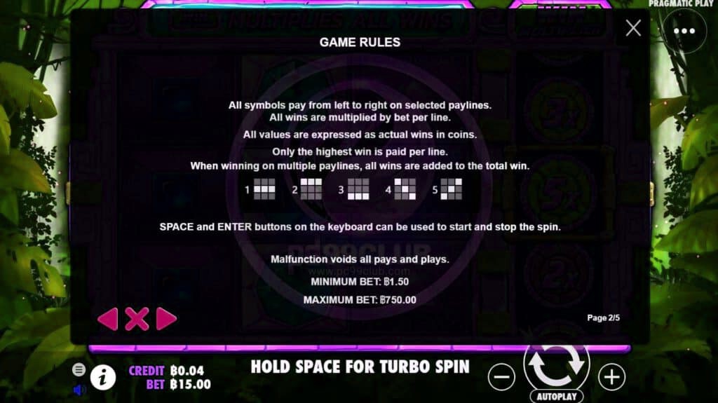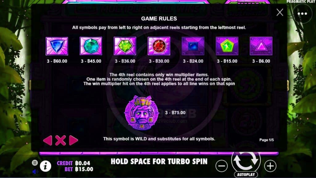 - สัญลักษณ์ทั้งหมดจะจ่ายจากซ้ายไปขวาแถวจ่ายที่เลือกชนะทั้งหมดถูกคูณด้วยเดิมพันต่อแถวทุกค่าแสดงเป็นจำนวนที่ชนะสูงสุดต่อแถวเท่านั้น