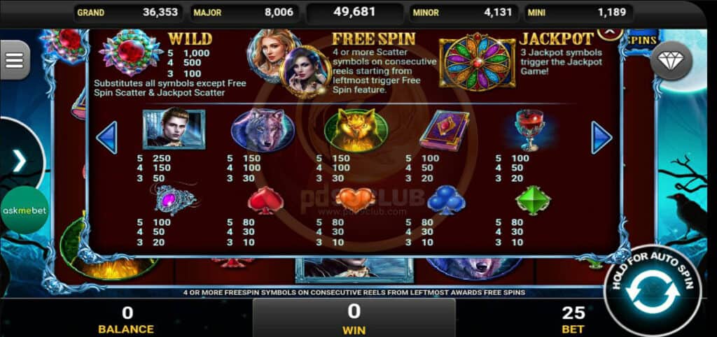 สัญลักษณ์ Wild ใช้แทนสัญลักษณ์ทั้งหมดยกเว้น Free Spin Scatter & Jackpot Scatter