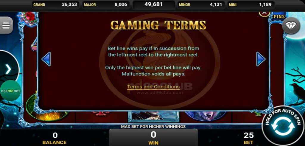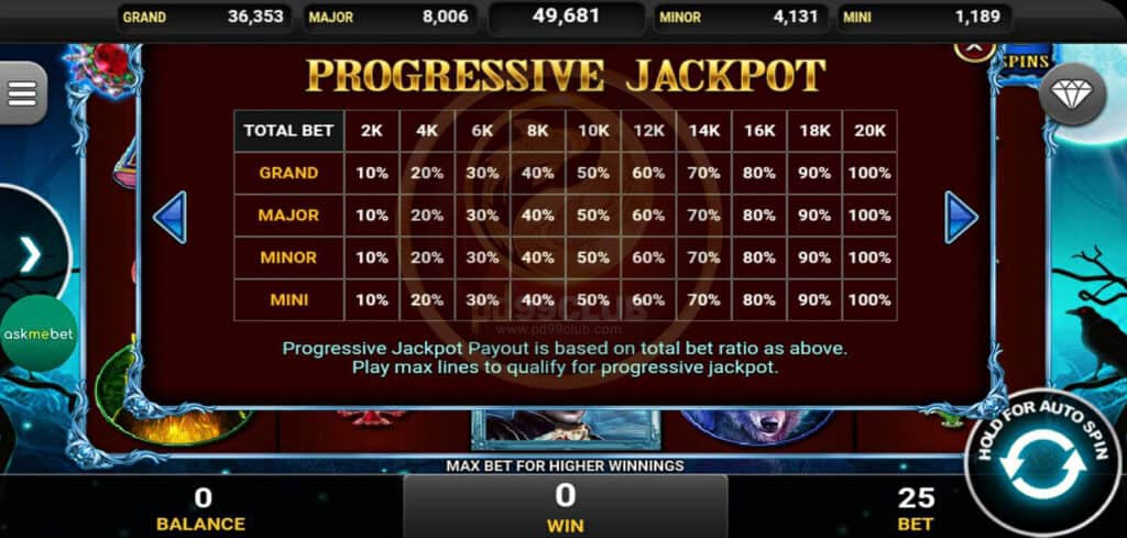 สัญลักษณ์ Jackpot Game 3 ตัว จะปรากฏบนวงล้อ 1,2 และ 3 จะทำให้ผู้เล่นเกมแจ็คพอตมีโอกาสที่จะได้รับรางวัลเป็นจำนวนเงินที่แสดงในแผนภูมิโปรเกรสซีฟแจ็คพอต
