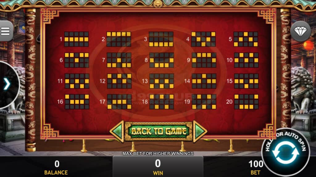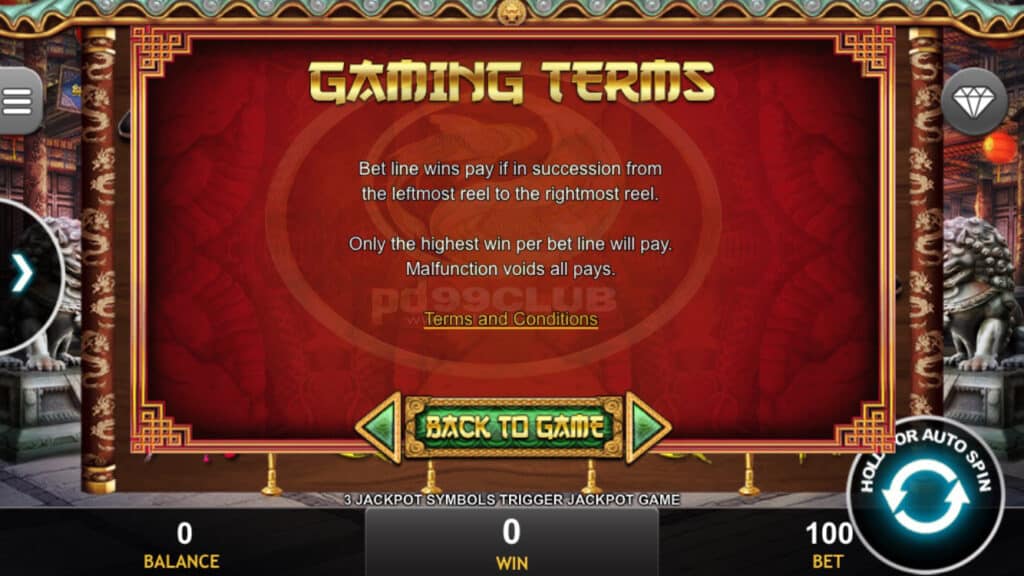 เงื่อนไขการเล่นเกมสายการเดิมพันชนะการจ่ายเงินหากต่อเนื่องกันจากรีลซ้ายสุดไปยังรีลขวาสุด เฉพาะผู้ชนะสูงสุดต่อบรรทัดเดิมพันเท่านั้นที่จะจ่าย ความผิดปกติเป็นโมฆะการจ่ายเงินทั้งหมด
