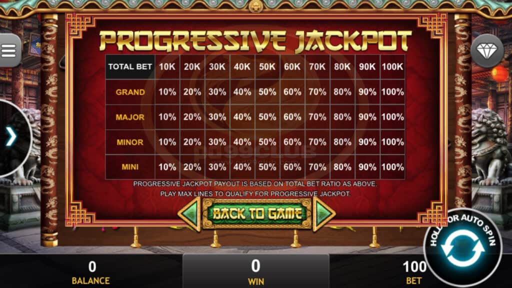 สัญลักษณ์ Progressive Jackpot การจ่ายเงินแจ็คพอตแบบก้าวหน้าขึ้นอยู่กับอัตราส่วนการเดิมพันทั้งหมดที่กล่าวมา เล่น MAX LINES เพื่อคุณสมบัติสำหรับแจ็คพอตที่ก้าวหน้า