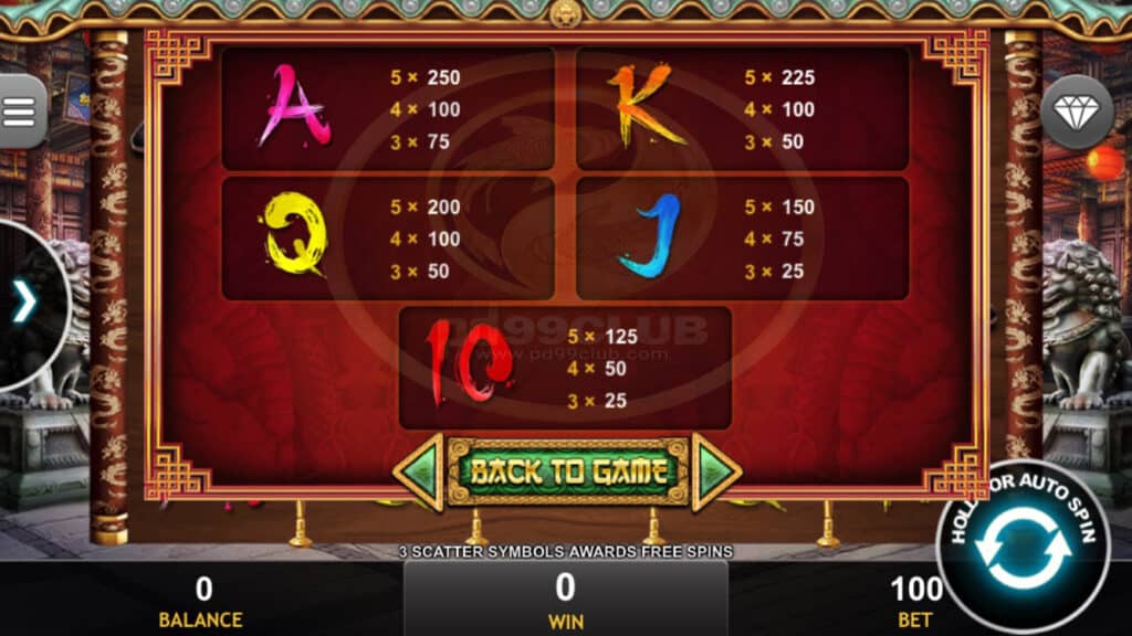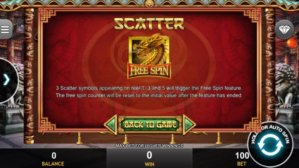 สัญลักษณ์ Scatter 3 สัญลักษณ์กระจายที่ปรากฏบนรีล 1, 3 และ 5 จะเรียกใช้คุณสมบัติ Free Spin ตัวนับการหมุนฟรีจะถูกรีเซ็ตเป็นค่าเริ่มต้นหลังจากคุณสมบัติสิ้นสุดลง