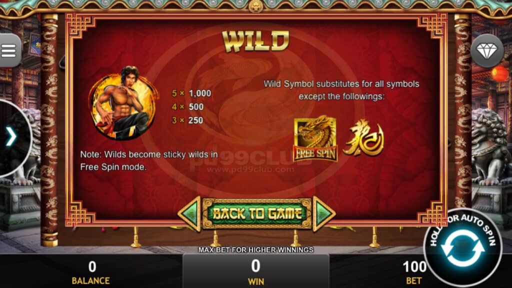 สัญลักษณ์ Wild สามารถใช้ทดแทนสัญลักษณ์ทั้งหมดยกเว้นสัญลักษณ์ Scatter และ Jackpot