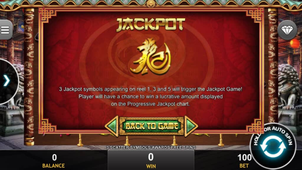 สัญลักษณ์ Jackpot 3 ตัวที่ปรากฏบนรีล 1, 3 และ 5 จะทำให้เกมแจ็คพอตขึ้น! ผู้เล่นจะมีโอกาสชนะรางวัลเป็นจำนวนเงินที่แสดงในแผนภูมิโปรเกรสซีฟแจ็คพอต
