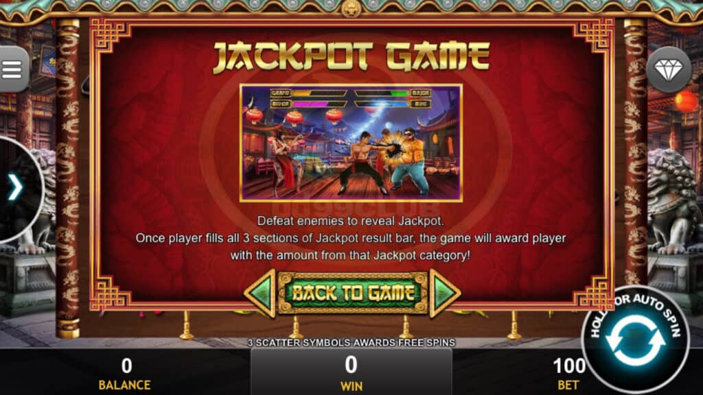 สัญลักษณ์ Jackpot Game เอาชนะศัตรูเพื่อเปิดแจ็คพอต เมื่อผู้เล่นเติมแถบผลแจ็คพอตครบทั้ง 3 ส่วนแล้วเกมจะให้รางวัลแก่ผู้เล่นด้วยจำนวนเงินจากหมวดแจ็คพอตนั้น!