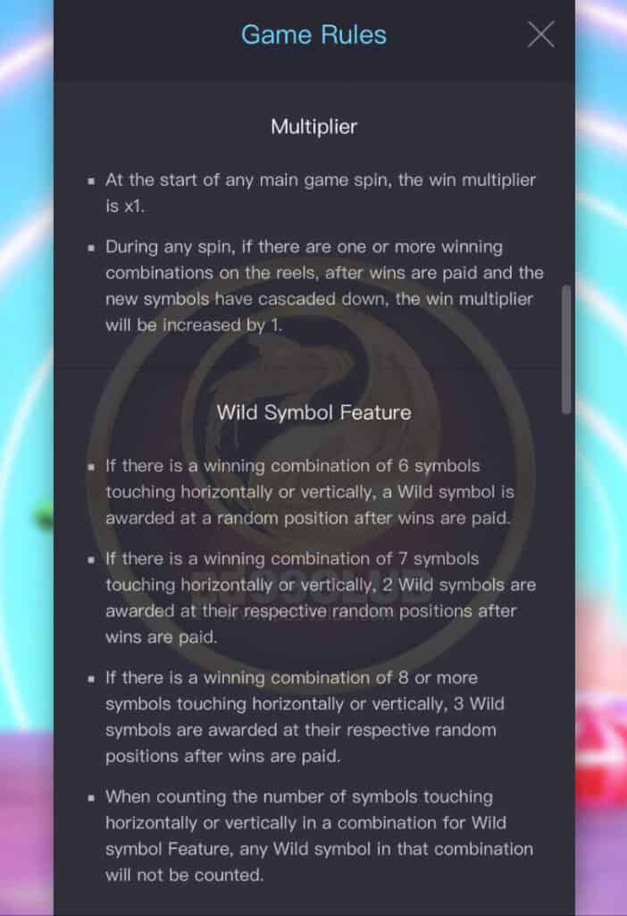 - หากมีการรวมกันของสัญลักษณ์ 8 ตัวขึ้นไปที่ชนะในแนวนอนหรือแนวตั้งจะมีการมอบสัญลักษณ์ไวด์ 3 ตัวที่ตำแหน่งสุ่มตามลำดับหลังจากได้รับเงินชนะแล้ว
