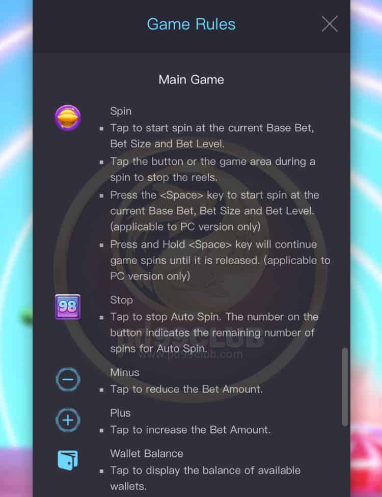 - กดปุ่ม เพื่อเริ่มหมุนที่การเดิมพันพื้นฐานขนาดเดิมพันและระดับการเดิมพันในปัจจุบัน (ใช้ได้กับเวอร์ชั่น PC เท่านั้น)