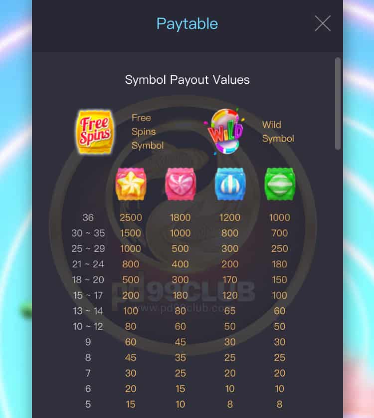 - สัญลักษณ์การจ่ายรางวัลของเกม Candy Bonanza มีทั้งหมด 8 สัญลักษณ์และสัญลักษณ์พิเศษ 2 สัญลักษณ์