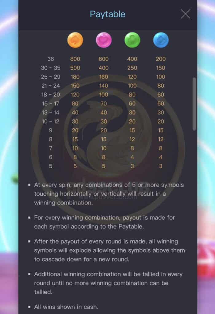 - การรวมกันที่ชนะเป็นเงินสดจะเท่ากับมูลค่าที่แสดงใน “ตารางการจ่ายเงิน” คูณด้วยขนาดเดิมพันและระดับการเดิมพัน