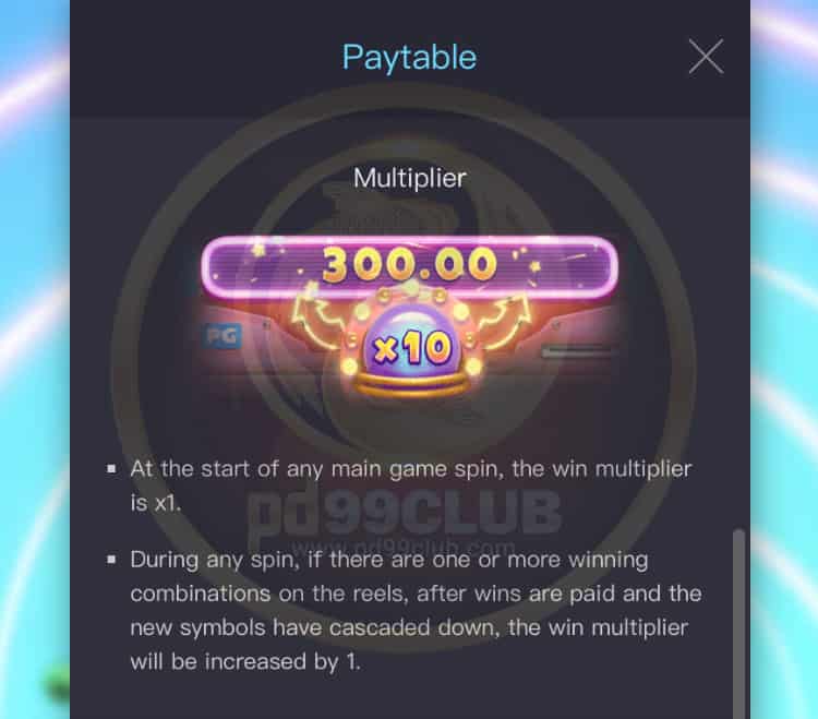 - เมื่อเริ่มฟีเจอร์ฟรีสปินตัวคูณการชนะคือ x1