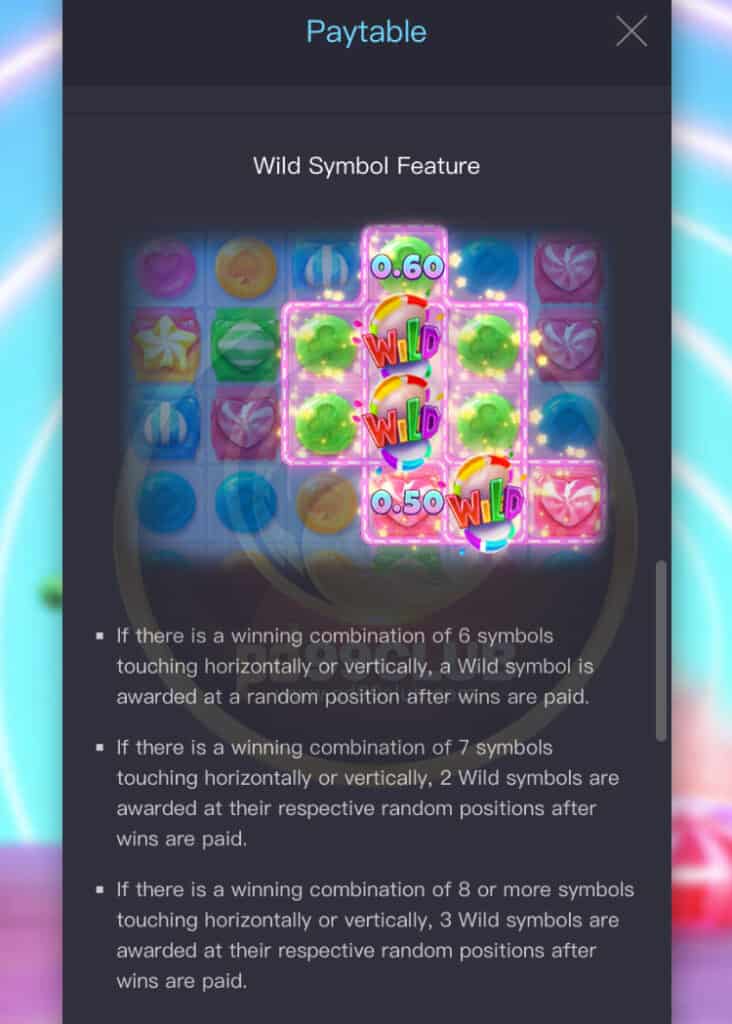 - หากมีการรวมกันของสัญลักษณ์ 6 ตัวที่สัมผัสกันในแนวนอนหรือแนวตั้งสัญลักษณ์ไวด์จะได้รับในตำแหน่งแบบสุ่มหลังจากที่มีการจ่ายเงินชนะ