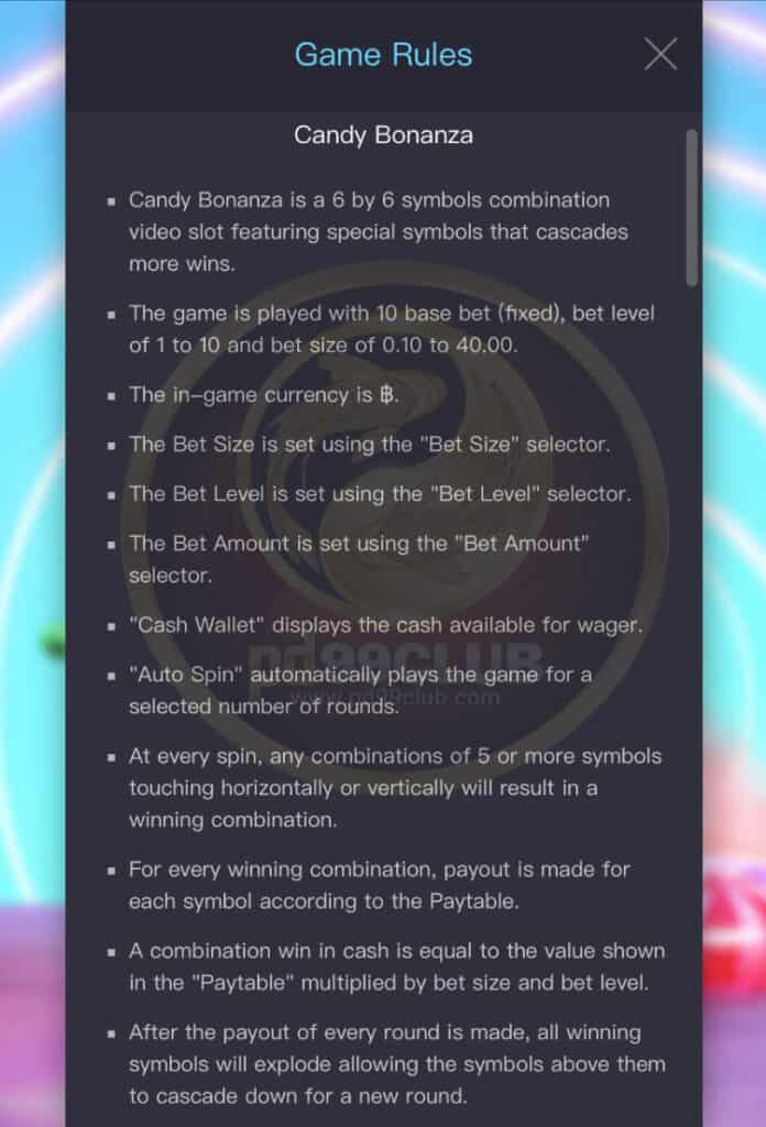 - Candy Bonanza เป็นสล็อตวิดีโอแบบผสม 6 ต่อ 6 สัญลักษณ์ที่มีสัญลักษณ์พิเศษที่เพิ่มจำนวนผู้ชนะ