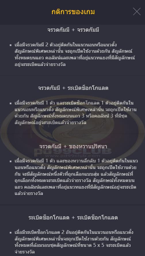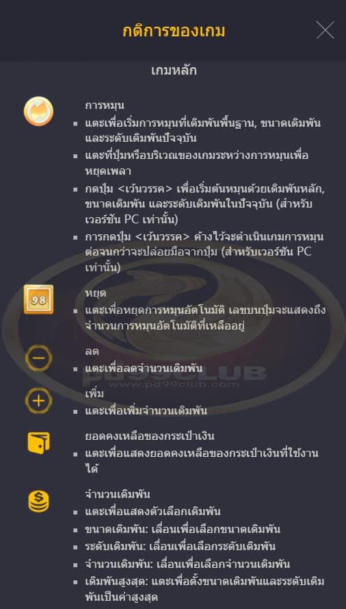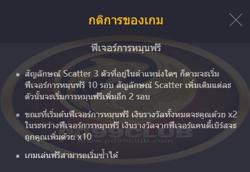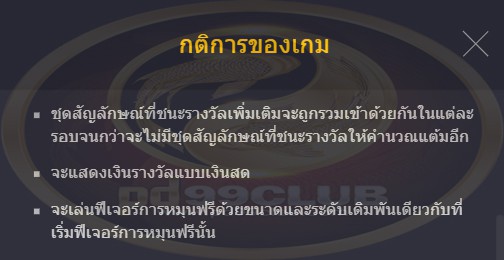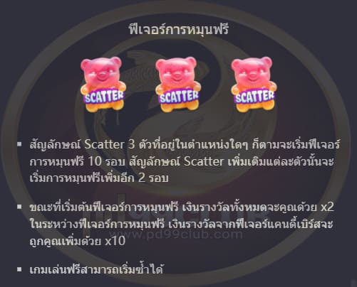 จะเล่นฟีเจอร์การหมุนฟรีด้วยขนาดและระดับเดิมพันเดียวกันกับการหมุนที่เริ่มฟีเจอร์การหมุนฟรีนั้น