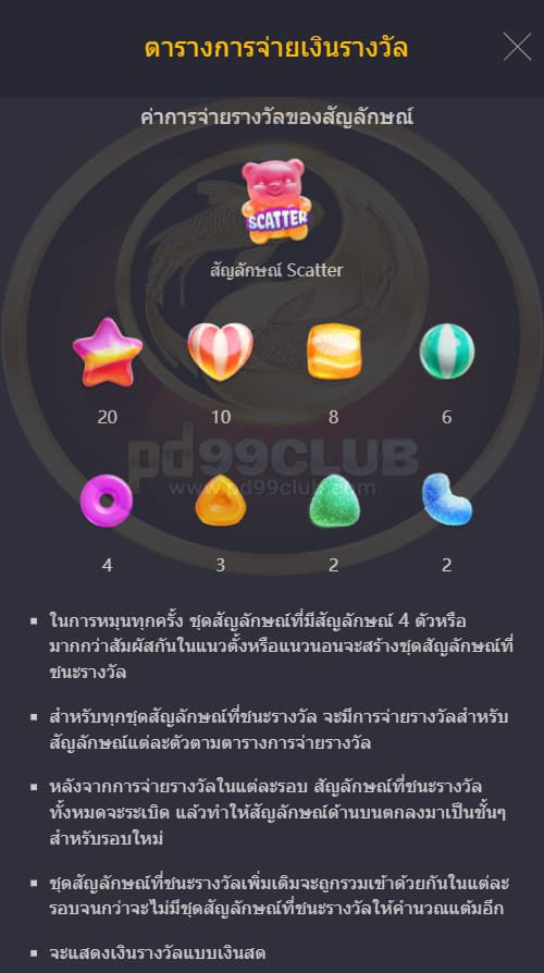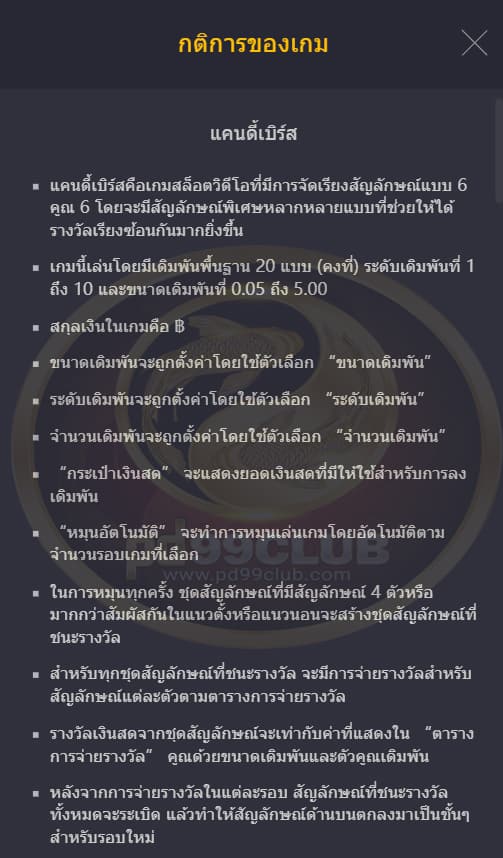 ที่มีเนื้อเรื่องของเกมมาจากน้ำตาลและส่วนผสมทุกอย่างที่ลงตัวขนมแสนอร่อยไม่จำกัดรอคุณอยู่ในเกมผู้เล่น จะสัมผัสดุถึงความหวานที่อบอวลในปากเกมนี้สร้างความพอใจให้กับคุณแน่นอนต้องตกตะลึงด้วยความประหลาดใจที่ซ่อนอยู่ โดยเกมสล็อต candy brust จะมาในรูปแบบของสล็อตที่มี 6 โรล 6 แถว ซึ่งเป็นรูปแบบที่มีโอกาสที่จะทำให้แจ็คพอตเกิดขึ้นได้ง่ายมากๆ