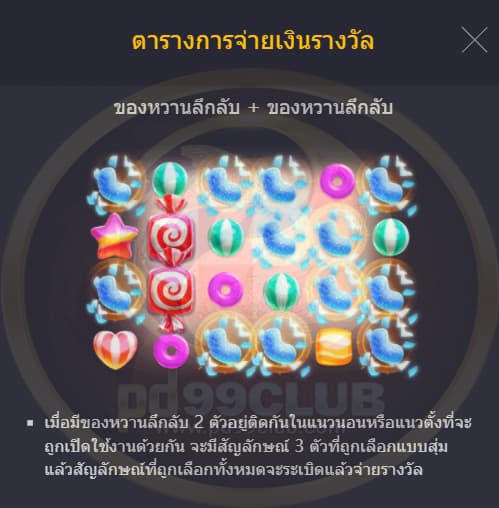 เมื่อมีของหวานลึกลับ 2 ตัวอยู่ติดต่อกันในแนวนอนหรือแนวตั้งที่จะถูกเปิดใช้งานด้วยกัน จะมีสัญลักษณ์ 3 ตัวที่ถูกเลือกแบบสุ่มแล้วสัญลักษณ์ที่ถูกเลือกทั้งหมดจะระเบิดแล้วจ่ายรางวัล
