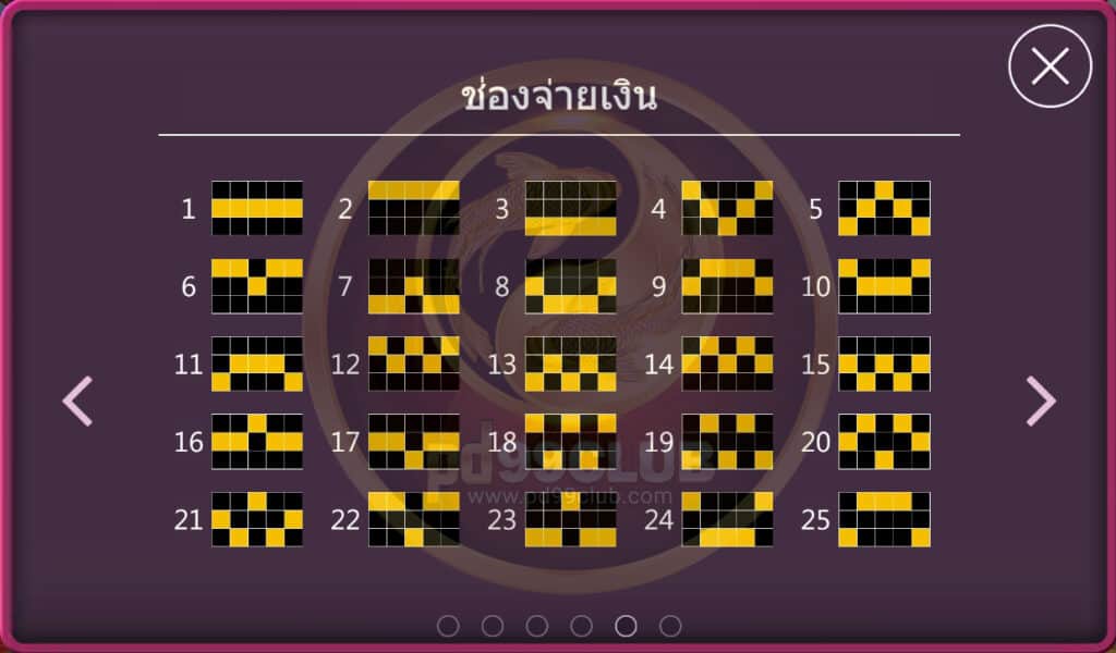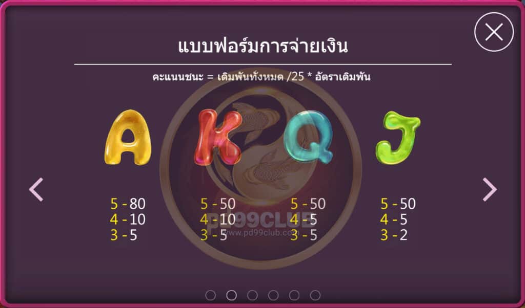 มีทั้งหมด 9 สัญลักษณ์ คะแนนชนะ=เดิมพันทั้งหมด/25*อัตราเดิมพัน อัตราการจ่ายของเกมเริ่มที่ 2 บาท จ่ายสูงสุด 500 บาท