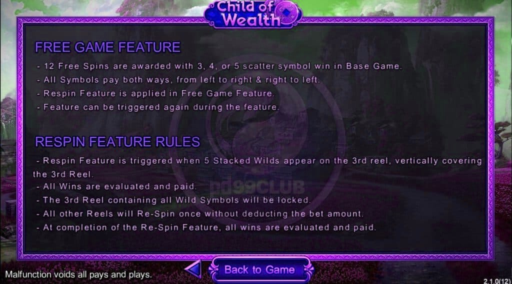 - ฟีเจอร์รีสปินจะเปิดใช้เมื่อมีไวลด์ซ้อน 5 ตัวปรากฏบนวงล้อที่ 3 และครอบคลุมวงล้อที่ 3 ในเเนวตั้ง